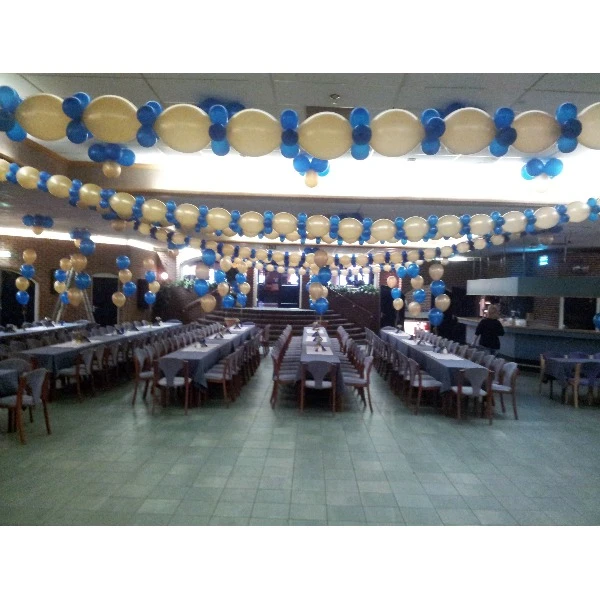 De decoratie bestaat uit doorknoop ballonnen kleur metallic.