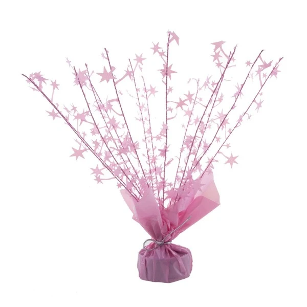 Het is omhuld door rozekleurig folie waardoor het mooi glimt. We hebben veel bijpassende ballonnen. Wat leuk is, is om een lint aan de ballon te doen en die vast te maken aan het gewicht. Zo maak je er een mooi geheel van.