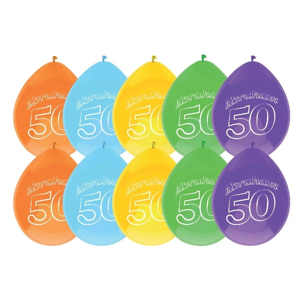 Wat is een verjaardag zonder ballonnen? Inderdaad! Ook bij een feestje voor Abraham horen bijpassende ballonnen. Deze verpakking bevat 10 vrolijk gekleurde ballonnen met de tekst 'Abraham 50'. Leuk om door de hele ruimte op te hangen. Deze ballonnen zijn geschikt om met lucht te vullen en zo op te hangen