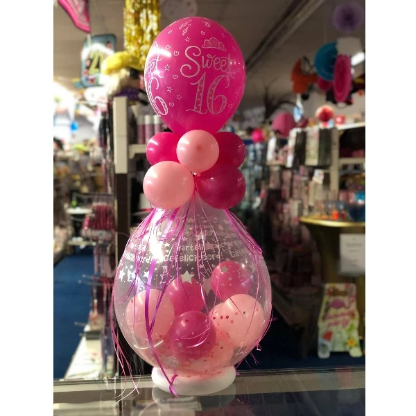 inclusief ballon en eventuele vulling van confetti of serpentines en incl. lint.
