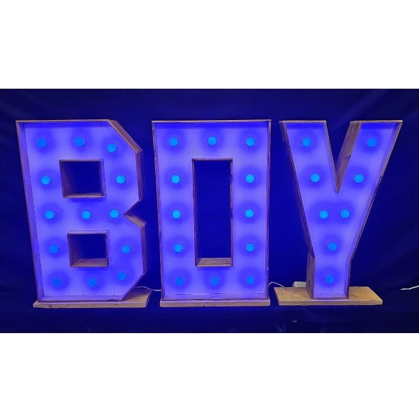 Huur de 1 meter hoge letters die het woord Boy samen vormen, met warm witte, Blauwe, of Roze lampen.