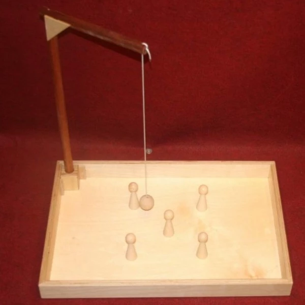 Plaats de 5 kegels op de cijfers en ga aan de kant van de slingerkogel staan. Gooi de kogel met een boog van u af, zodat hij op de terugweg kegels om zal stoten. Vang de kogel op, zodra deze weer bij u is aangekomen. Alleen de kegels die de kogel op de terugweg omgestoten heeft, tellen voor de punten. De foutief omgestoten kegels zet u weer rechtop. U mag drie keer werpen, waarbij u de kegels die u omgestoten heeft, laat liggen.