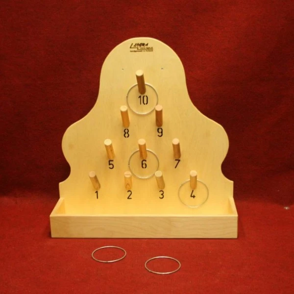 Werp de 6 ringen stuk voor stuk om de kegels op het bord. Daarna mag u nog twee pogingen doen met de ringen die niet om de kegels hangen.