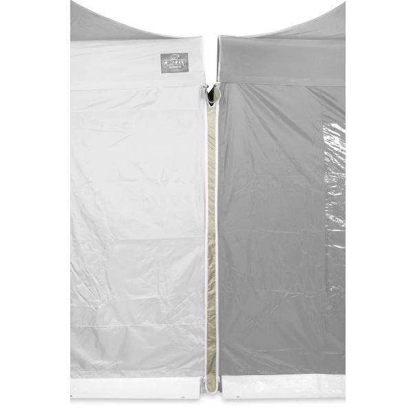 De zijwanden worden met aan de bovenkant klitteband en aan de zijkanten ritsluitingen bevestigd.