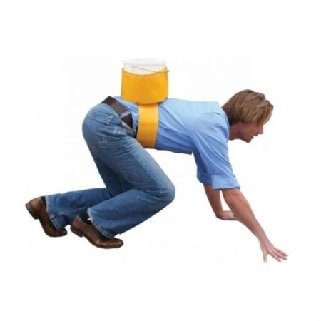 - De deelnemer bevestigd dmv klittenband de pvc houder onder zijn borst, zodat de houder met emmer op de rug van deelnemer komt te zitten.